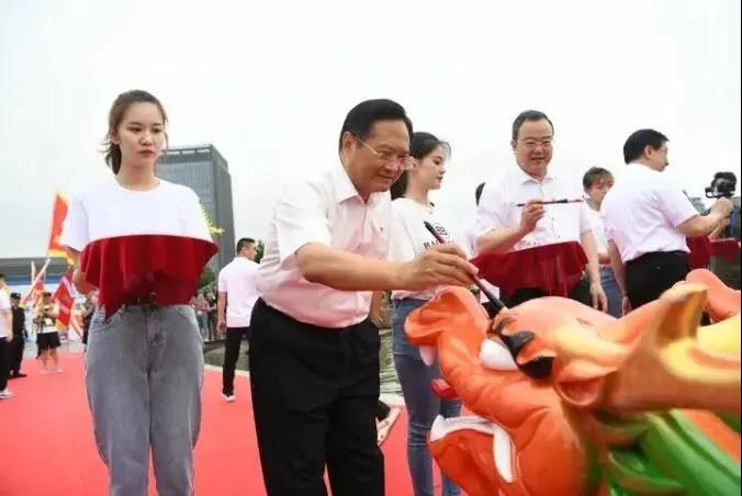 褚子育、張兵、毛宏芳、劉冬生、高玲慧、馬永良、王濤共同為龍舟點(diǎn)睛;祝亞偉、陳利眾、敖考權(quán)等向踏白船賽隊(duì)領(lǐng)隊(duì)授旗。