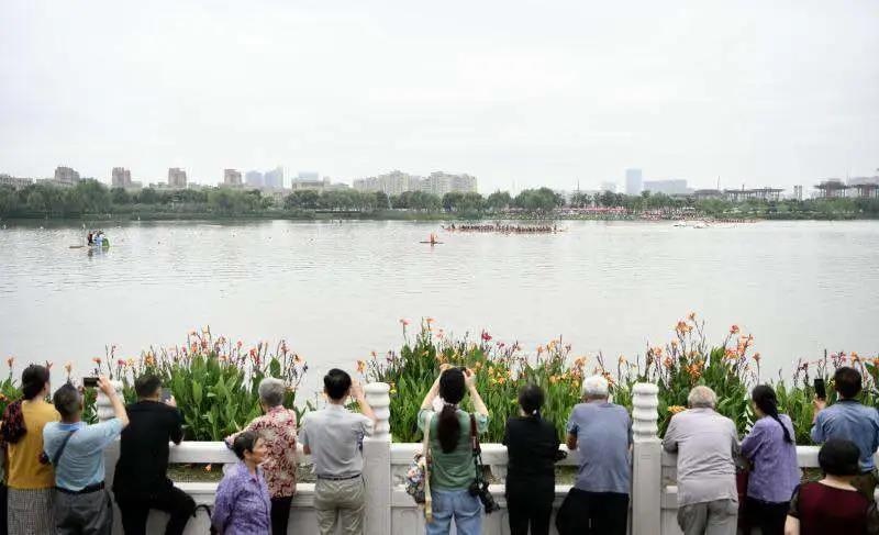 岸邊,來(lái)自世界各地歡度端午觀眾人頭攢動(dòng),吶喊加油聲持續(xù)不斷。龍舟競(jìng)渡作為每年端午的極受歡迎的活動(dòng)之一,吸引眾多市民、游客沿湖觀看,為湖中拼搏的運(yùn)動(dòng)員加油助威!