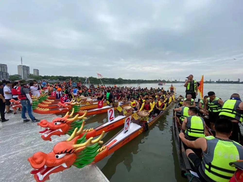 參賽選手們都信心滿滿,駕龍舟奮勇?tīng)?zhēng)先,現(xiàn)場(chǎng)鼓聲陣陣、喊聲沖天。