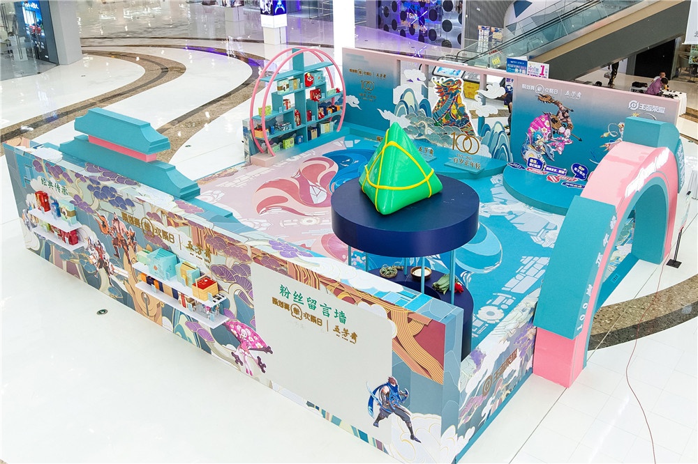 快閃店分為習粽區、游戲區、英雄區、禮盒區,玩家在入口處就能獲得挑戰卡,按照游戲規則,分別需要學會投壺、丟沙包,練習眼力及手勁,再去習粽區,跟從五芳齋專業粽藝師學習裹粽技藝,以及和5大英雄探討英雄之道獲得合影,最后去禮盒區挑選適合送給親友的好禮,充分體驗王者榮耀峽谷風情的端午節。
