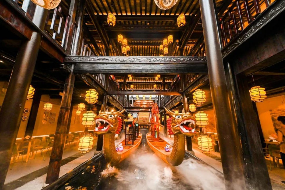 輕啟朱門,粉墻黛瓦,詩情畫意,一派風情。抬望眼,霸氣的龍舟立于中庭,江南韻味十足的中式閣樓、小橋流水應有盡有。傳統的木質鉚接樓面,二十四節氣之景掩映其中,好一派溫柔的江南風情。