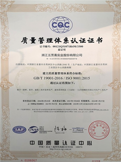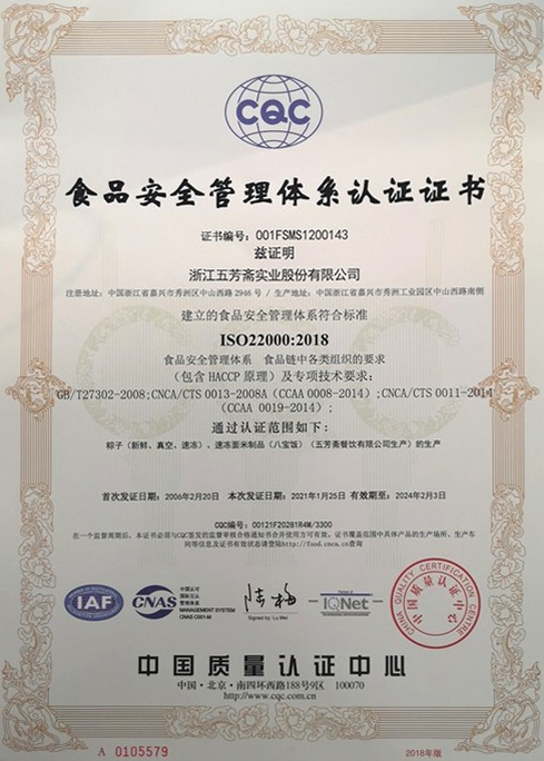 五芳齋在全國同行業(yè)率先通過了ISO9001、ISO22000國際質(zhì)量體系認(rèn)證,后又導(dǎo)入ISO14001環(huán)境管理體系和OHSAS18001職業(yè)健康安全管理體系。
